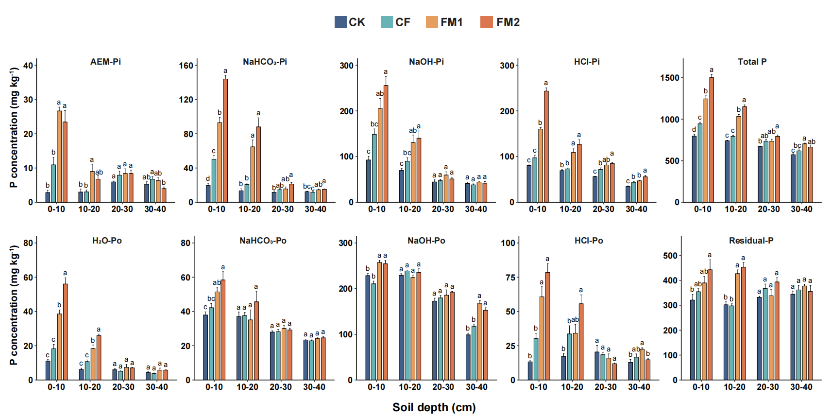 圖1 黑土剖面(0-40 cm)不同磷組分含量。不施肥(CK),單施化肥(CF),CF配施15 Mg ha-1牛糞有機(jī)肥(FM1),以及CF配施30 Mg ha-1牛糞有機(jī)肥(FM2)
