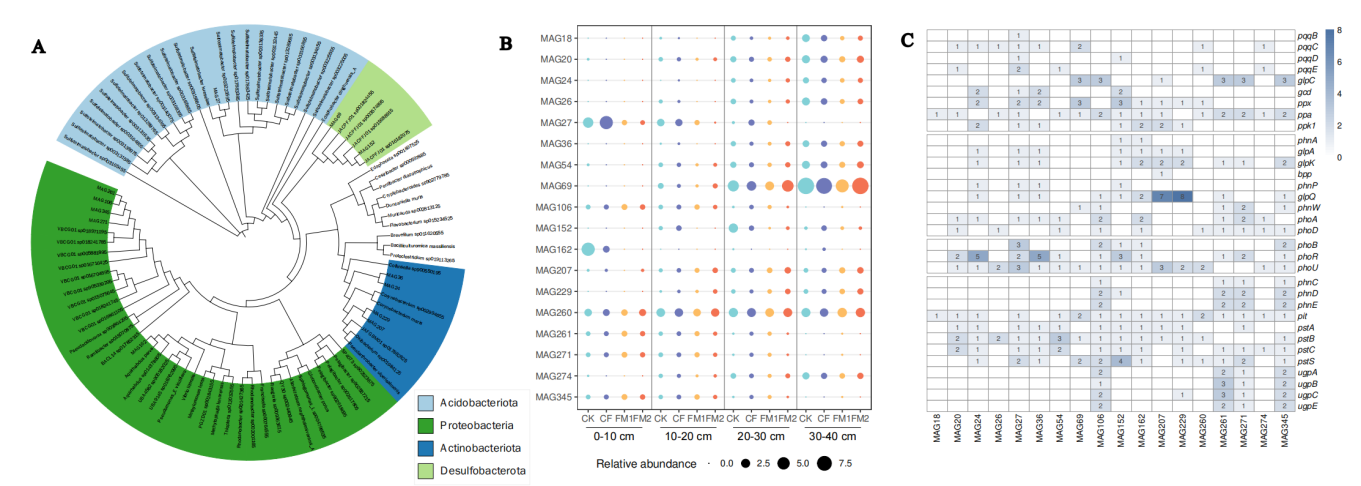 不同施肥處理在不同土壤剖面下塑造了獨(dú)特的磷相關(guān)微生物群落結(jié)構(gòu)和網(wǎng)絡(luò)特征。施用有機(jī)肥增加了無(wú)機(jī)磷溶解基因的相對(duì)豐度,尤其在0–10 cm和30–40 cm土層,同時(shí)降低了所有土層中磷饑餓基因豐度。單施化肥和化肥配施有機(jī)肥處理均提高了10–20 cm和30–40 cm土層中有機(jī)磷礦化基因的豐度。gcd基因的豐度與表層土壤中的無(wú)機(jī)磷溶解呈正相關(guān),而ppk1、ppa和ppx基因豐度則與下層土壤中的無(wú)機(jī)磷溶解呈正相關(guān)。宏基因組組裝(MAGs)構(gòu)建結(jié)果表明,深層土壤更有潛力蘊(yùn)藏參與磷循環(huán)的未知微生物譜系及功能基因,這不僅擴(kuò)展了針對(duì)磷循環(huán)微生物多樣性的認(rèn)知,還表明深層土壤是新型微生物譜系和功能基因的儲(chǔ)庫(kù),為篩選研究磷循環(huán)基因的潛在模式微生物提供了有價(jià)值的見(jiàn)解(圖2)。研究結(jié)果提倡化肥配施有機(jī)肥以增強(qiáng)表層土壤中微生物對(duì)磷的活化,未來(lái)的研究應(yīng)優(yōu)先對(duì)深層土壤微生物類群進(jìn)行功能驗(yàn)證,以完善可持續(xù)的磷管理策略。