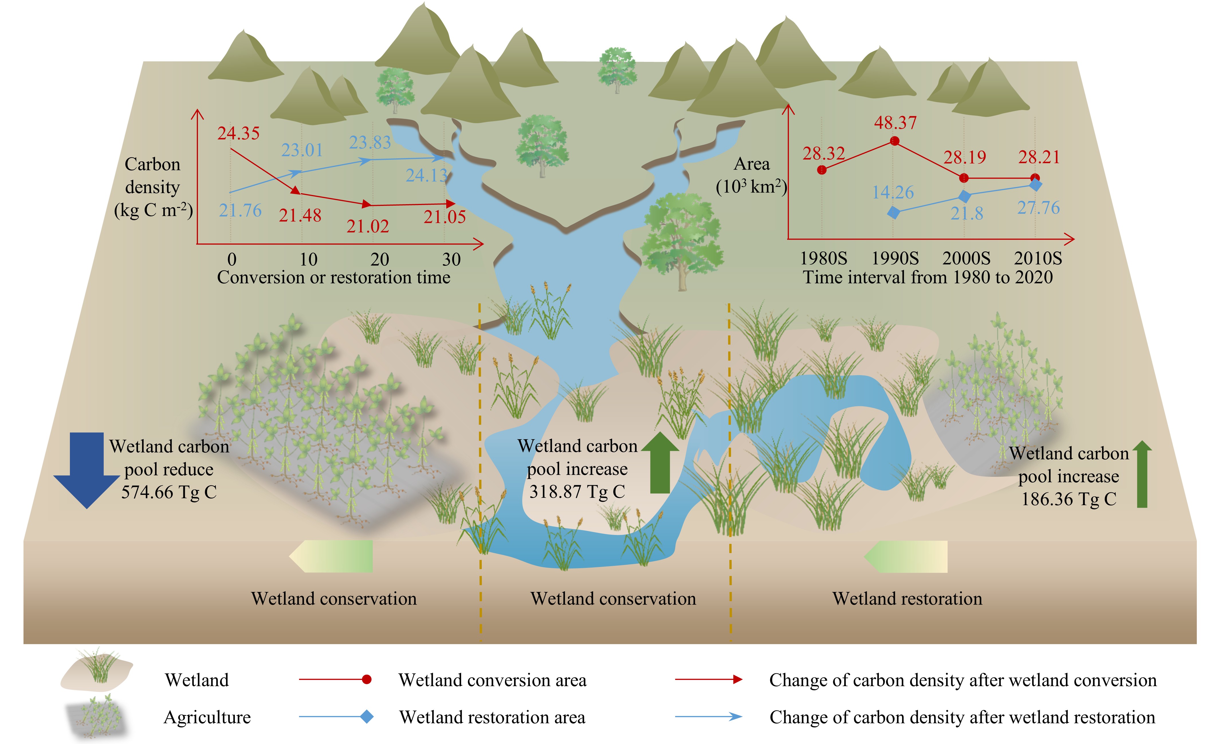 研究結果表明:在研究期內(nèi),我國濕地農(nóng)田化導致了明顯的土壤有機碳損失,其中約86%的碳損失發(fā)生在轉化后的前10年,隨后下降速度減緩并逐漸趨于穩(wěn)定。在這四十年間,濕地農(nóng)田化導致累計碳損失約 574.66 Tg C,相當于全國濕地土壤碳庫的約 10.6%。相比之下,濕地恢復(退耕還濕)促進了土壤有機碳的增加,盡管水平仍低于改造前的水平。保護和恢復措施能夠共同抵消濕地農(nóng)田化所導致的一多半碳損失;其中,恢復措施貢獻了 186.36 Tg C碳增加(約占濕地土壤碳庫的 3.43%),抵消了約 32.4%的濕地農(nóng)田化導致的碳損失。