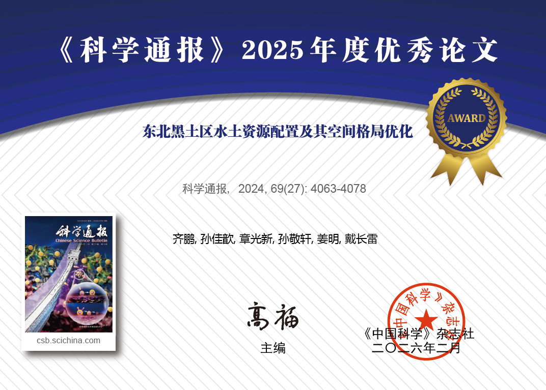 近日,國內(nèi)權(quán)威學(xué)術(shù)期刊《科學(xué)通報》公布了2025年度優(yōu)秀論文評選結(jié)果。由中國科學(xué)院東北地理與農(nóng)業(yè)生態(tài)研究所齊鵬副研究員(第一作者)、孫佳歆博士、章光新研究員、孫敬軒博士和姜明研究員(通訊作者)聯(lián)合黑龍江大學(xué)戴長雷教授等學(xué)者共同完成的研究成果——《東北黑土區(qū)水土資源配置及其空間格局優(yōu)化》,憑借論文在保障國家糧食安全與生態(tài)安全領(lǐng)域的科學(xué)貢獻與應(yīng)用價值、論文的關(guān)注度及引用率等多項指標,成功榮獲《科學(xué)通報》2025年度優(yōu)秀論文獎(圖1)。
