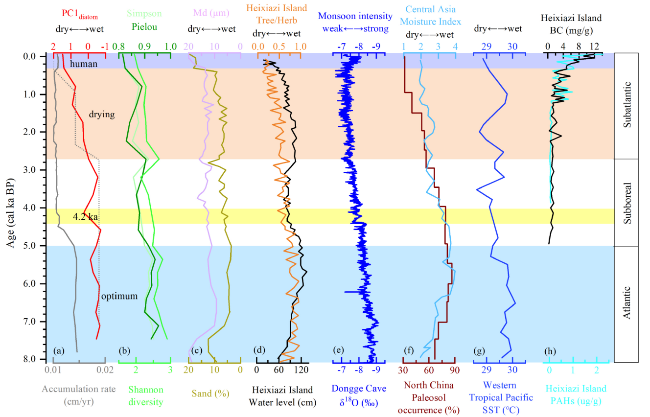 東北地理所大氣環(huán)境與生態(tài)演變學科組基于多指標古生態(tài)學記錄,結合硅藻和粒度特征,重建了抓吉濕地歷史時期水位變化過程,探討中晚全新世三江平原濕地水文演化對EASM的響應機制。研究結果表明:抓吉濕地的水位波動在全新世中晚期與EASM強度緊密相關。由于硅藻對水文氣候變化的高度敏感性,其清晰地記錄了溫暖濕潤的全新世氣候適宜期、中世紀暖期,以及寒冷干燥的4.2ka事件和小冰期等關鍵氣候事件。在大西洋時期,抓吉濕地的PC1diatom、粒度中值粒徑和砂含量均處于最低水平,表明當時水位最高。受強EASM影響,氣候條件適宜,抓吉濕地的硅藻物種多樣性及沉積物累積速率均達到最高。在亞北方期,特別是亞大西洋時期,PC1diatom和粒度均表明由于EASM強度減弱,抓吉濕地水位持續(xù)下降。濕地干旱化顯著降低了沉積物累積速率和硅藻物種多樣性。值得注意的是,硅藻組合最顯著的變化是300年前干旱指示物種Hantzschia amphioxys和Pinnularia subcapitata突然增加,抓吉濕地的砂含量也達到峰值。近300年來人類活動的加劇導致抓吉濕地嚴重干旱,硅藻物種多樣性降至最低。三江平原的農業(yè)活動導致了土壤侵蝕,致使?jié)竦氐某练e速率有所增加。