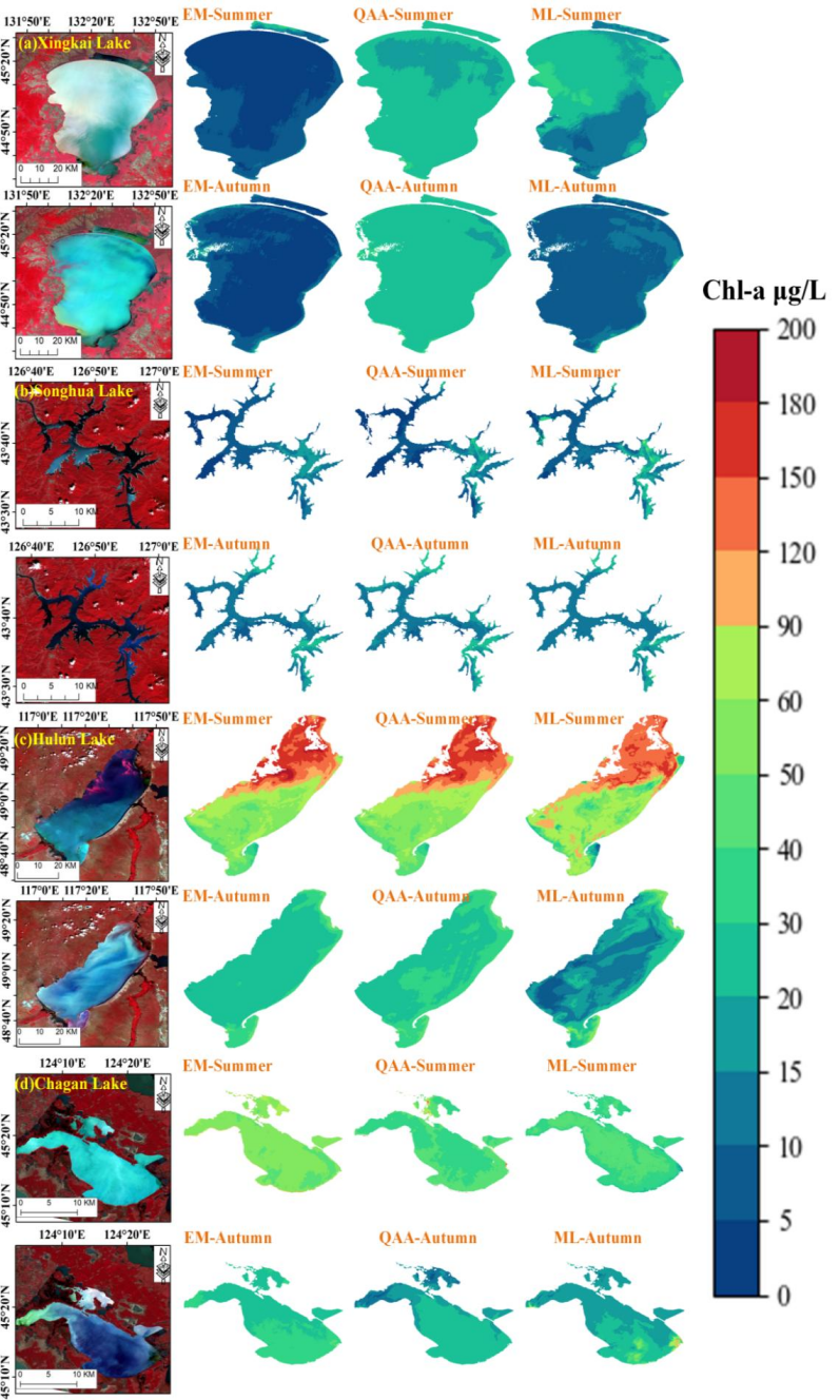 圖1 利用HJ-2影像在四個(gè)典型湖泊中應(yīng)用不同葉綠素a算法進(jìn)行夏季和秋季空間分布制圖,即:(a) 興凱湖(XKL),(b) 松花湖(SHL),(c) 呼倫湖(HLL)和 (d) 查干湖(CGL)。EM代表經(jīng)驗(yàn)?zāi)P停琎AA代表半解析模型,ML代表機(jī)器學(xué)習(xí)模型。