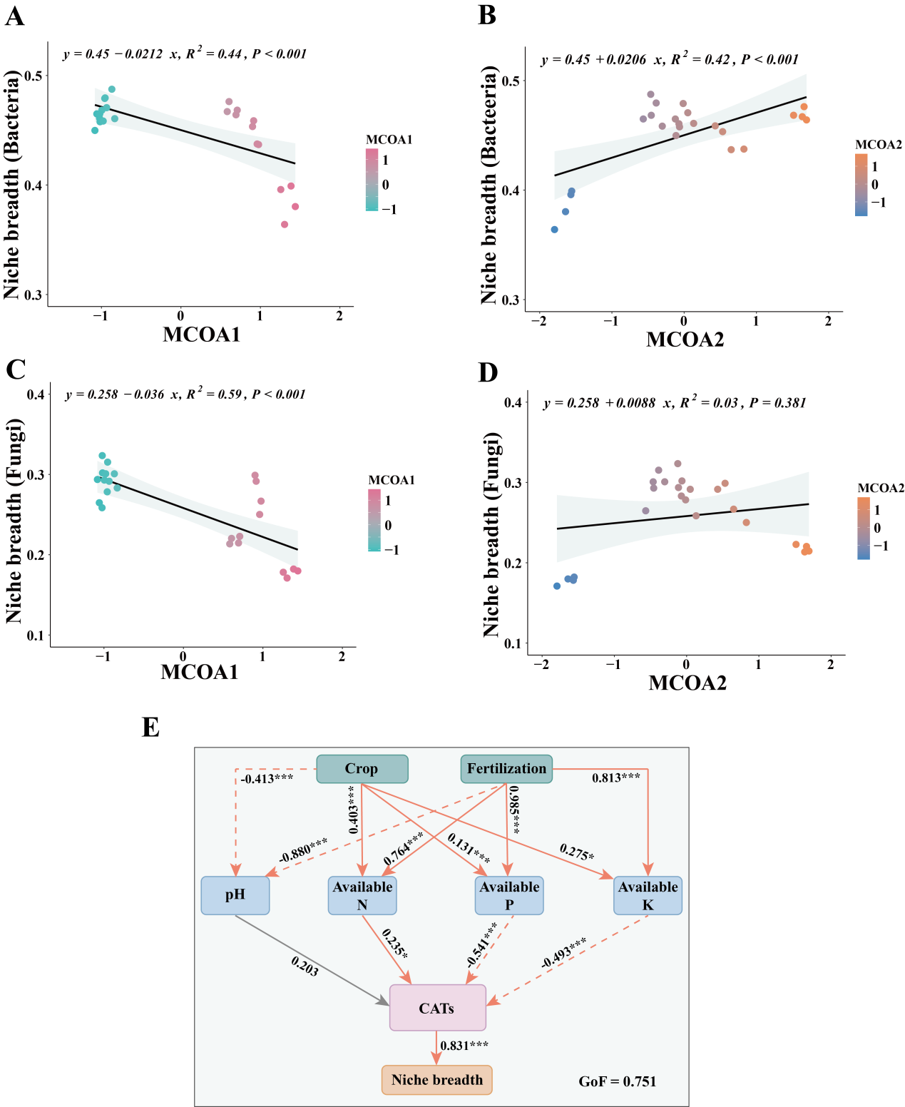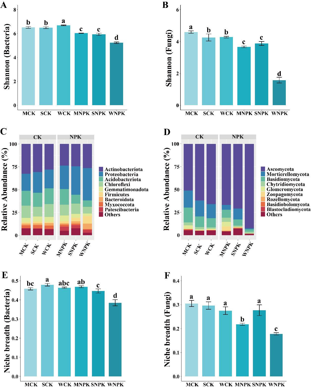 圖1 化肥施用對(duì)土壤微生物群落組成和生態(tài)位寬度的影響