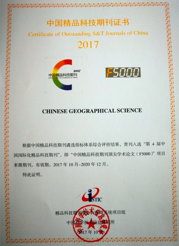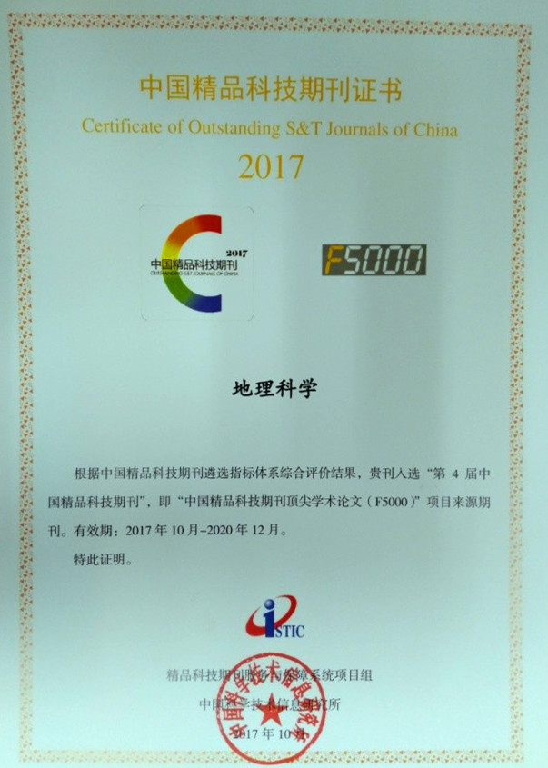 2017年10月31日,中國(guó)科學(xué)技術(shù)信息研究所在北京國(guó)際會(huì)議中心舉辦了“2017年中國(guó)科技論文統(tǒng)計(jì)結(jié)果發(fā)布會(huì)”。東北地理所主辦的期刊《地理科學(xué)》和《Chinese Geographical Science》分別入選“第4屆中國(guó)精品科技期刊”和“第4屆中國(guó)國(guó)際化精品科技期刊”,即“中國(guó)精品科技期刊頂尖學(xué)術(shù)論文(F5000)”項(xiàng)目來源期刊,有效期為2017年10月—2020年12月。