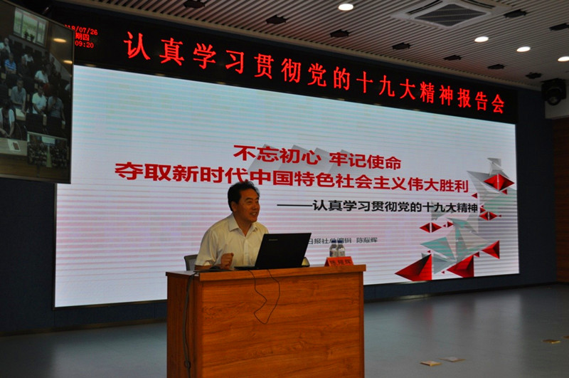 7月26日下午,為把學(xué)習(xí)宣傳貫徹黨的十九大精神不斷引向深入,東北地理所召開學(xué)習(xí)十九大精神專題報告會(哈區(qū)視頻),大會邀請黨的十九大精神吉林省委宣講團成員、吉林日報社總編輯陳耀輝做專題報告,全所190余位黨員和職工參加報告會。