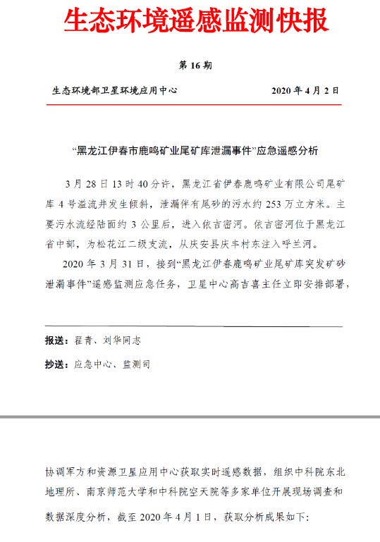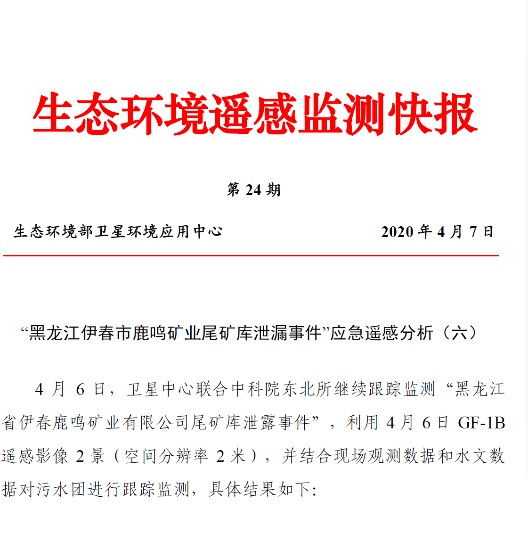 2020年3月28日,黑龍江省伊春市鹿鳴礦業(yè)有限公司鉬礦尾礦庫4號溢流井發(fā)生傾斜,泄漏伴有尾砂的污水約253萬立方米,污水流出約3公里后進入依吉密河。黑龍江省委、省政府立即啟動Ⅱ級應(yīng)急響應(yīng)并成立應(yīng)急搶險指揮部,生態(tài)環(huán)保部應(yīng)急指導(dǎo)組副部長翟青等帶領(lǐng)專家組趕赴現(xiàn)場指導(dǎo)應(yīng)急處置工作,迅速聯(lián)合制定了“堵水源、截水頭”的具體處置方案。按照專家組意見,在“泄漏水頭”設(shè)置10道攔截壩,減緩降低尾礦漿水下泄速度和濃度,采取投放絮凝劑、活性炭的方式,對污染物進行吸附和絮凝沉淀,防止污染物向下游遷移。截至目前,泄漏點已完成封堵,事件取得階段性重要進展,依吉密河下游污染物濃度大幅下降,上游河段已經(jīng)開始啟動清淤工作;隨著污水團向下游遷移,呼蘭河中的污染峰值在逐步衰減。據(jù)應(yīng)急專家分析研判,尾礦壩不存在安全風(fēng)險,下游農(nóng)田環(huán)境風(fēng)險和飲用水安全風(fēng)險可控。