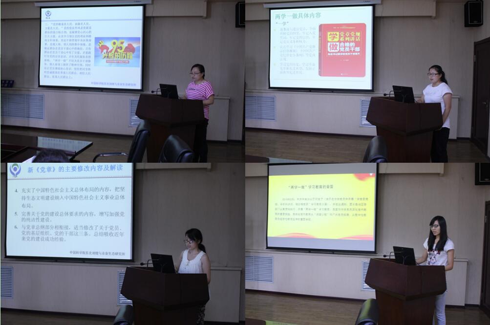 會上,行政機關黨支部趙春萍同志作了《積極參加“兩學一做”做合格黨員》;大豆黨支部翟紅同志作了《認真學習黨章黨規(guī)、習總書記系列重要講話,增強黨性修養(yǎng)》,黑土黨支部嚴君同志作了《以黨章為鏡 錘煉黨性作風——學習 “兩學一做”心得體會》,研究生黨支部王亞英同志作了《“兩學一做”學習心得》,各支部同志結合近期的“兩學一做”學習教育暢談了自己學習體會。