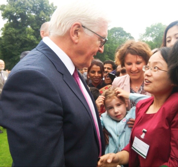 2017年6月29日,我所孫新博士與來自79個國家的洪堡學者在德意志聯(lián)邦共和國總統(tǒng)府望景宮,一起得到德國總統(tǒng)弗蘭克-瓦爾特·施泰因邁爾(Frank-Walter Steinmeier)先生和德國洪堡基金會主席赫爾穆特·施瓦茨(Helmut Schwarz)教授的集體接見,并與施泰因邁爾總統(tǒng)面對面交談和合影留念。