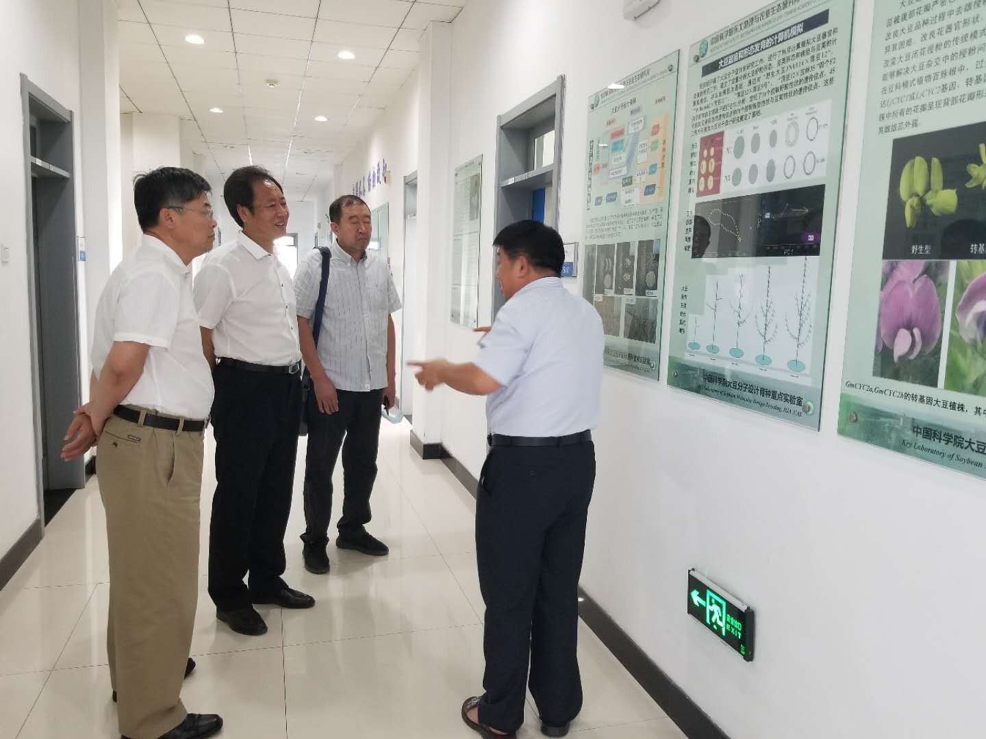 隨后,崔軍先后到大豆分子育種學(xué)科組、鹽漬土生態(tài)與改良學(xué)科組進(jìn)行現(xiàn)場調(diào)研。馮獻(xiàn)忠研究員匯報(bào)了國家重點(diǎn)研發(fā)計(jì)劃“主要經(jīng)濟(jì)作物分子設(shè)計(jì)育種”項(xiàng)目情況。項(xiàng)目培育的大豆新品種使我國大豆育種進(jìn)入國際水平;東生和合農(nóng)系列大豆品種,連續(xù)四年累計(jì)在我國大豆主產(chǎn)區(qū)種植面積最大,成為我國大豆“振興計(jì)劃”的主栽品種,為解決大豆卡脖子問題提供了優(yōu)良的品種。崔軍聽后給予充分肯定同時(shí)指出,正在建設(shè)的“大豆人工智能育種平臺”應(yīng)加快進(jìn)度,為吉林農(nóng)業(yè)發(fā)展提供變革性技術(shù)。