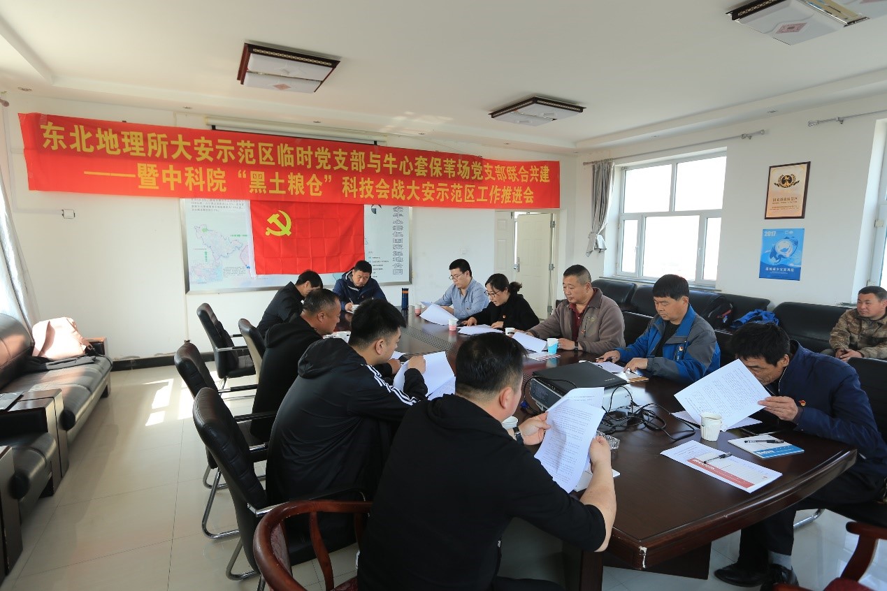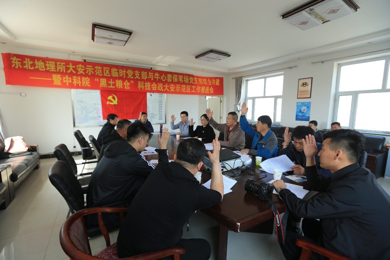本次會(huì)議建立了東北地理所大安示范區(qū)臨時(shí)黨支部與牛心套保葦場(chǎng)黨支部聯(lián)合共建的新機(jī)制,樹起了會(huì)戰(zhàn)一線高高飄揚(yáng)的第一面黨旗,強(qiáng)化了黨員在院地合作中的先鋒模范作用,彰顯了黨組織在“黑土糧倉(cāng)”科技會(huì)戰(zhàn)中的戰(zhàn)斗堡壘作用,示范區(qū)臨時(shí)黨支部的建立必將為“黑土糧倉(cāng)”科技會(huì)戰(zhàn)提供堅(jiān)強(qiáng)的組織保障。
