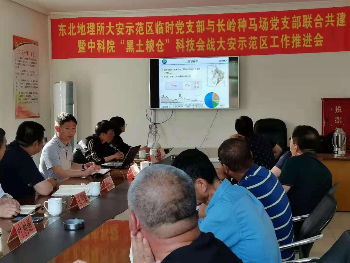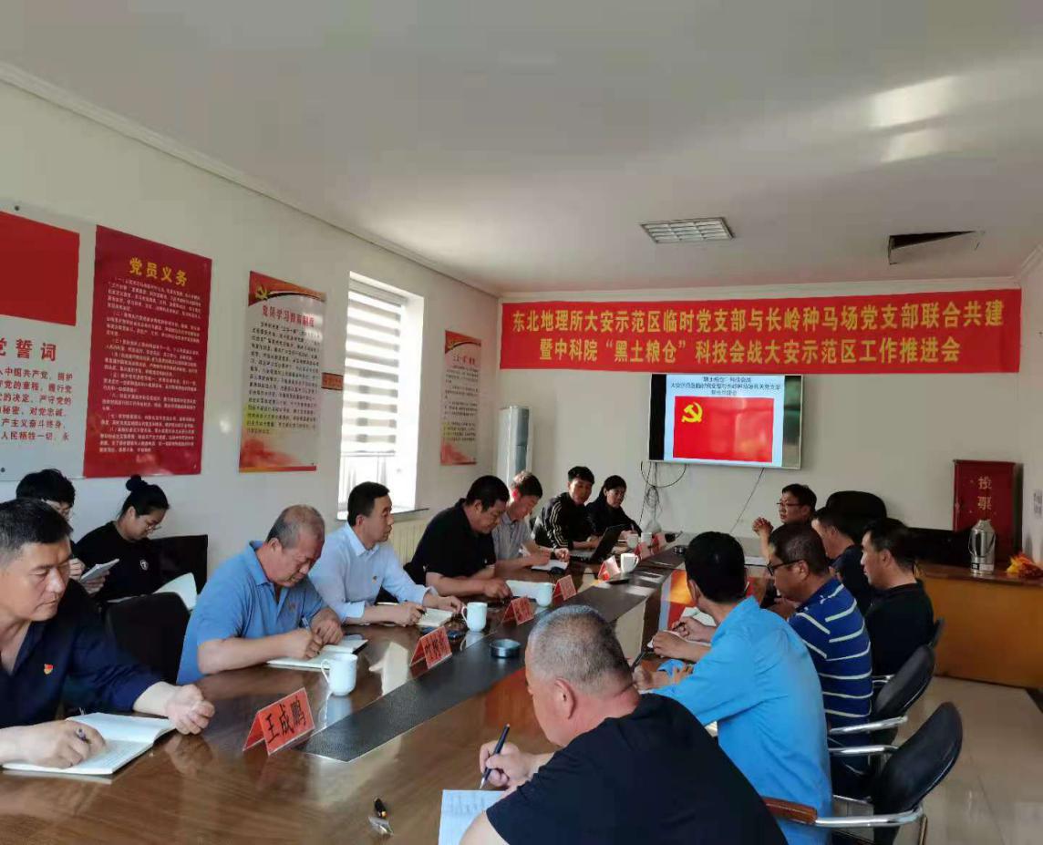 5月20日,東北地理所大安示范區(qū)臨時(shí)黨支部與長嶺種馬場(chǎng)機(jī)關(guān)黨支部開展聯(lián)合共建活動(dòng),在長嶺種馬場(chǎng)場(chǎng)部會(huì)議室召開中科院“黑土糧倉”科技會(huì)戰(zhàn)(以下簡稱“黑土?xí)?zhàn)”)大安示范區(qū)工作推進(jìn)討論會(huì)。東北地理所大安示范區(qū)臨時(shí)黨支部書記黃迎新,長嶺種馬場(chǎng)黨委書記、場(chǎng)長張鐵軍,副場(chǎng)長張明制出席會(huì)議。東北地理所大安示范區(qū)臨時(shí)黨支部李強(qiáng)、胡娟及長嶺種馬場(chǎng)機(jī)關(guān)10名黨員代表參加本次會(huì)議,4名社區(qū)群眾列席會(huì)議。