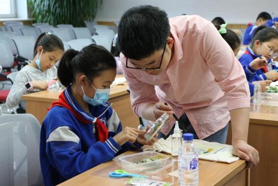科普報告后,濕地生態(tài)與環(huán)境重點實驗室張振剛博士帶領(lǐng)同學們動手制作植物浮游瓶。同學們通過標本制作直觀的了解了植物的結(jié)構(gòu)特征,在科普志愿者的分組指導下,認真選取植物葉片和花朵,發(fā)揮想象力和創(chuàng)造力,組合成各式各樣的美麗的植物浮游瓶。