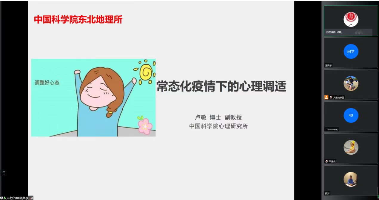 為更好地幫助東北地理所師生在疫情期間調適好心緒,為全面復工復產(chǎn)做好準備,4月15日,東北地理所邀請中科院心理研究所國家公務員心理健康應用研究中心副主任盧敏老師在線上進行了主題為“常態(tài)化疫情下的心理調適”的心理健康專題講座。本次講座由人事教育處處長郭琳主持,研究生、導師共計100余人參會。