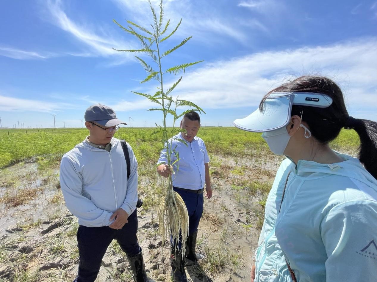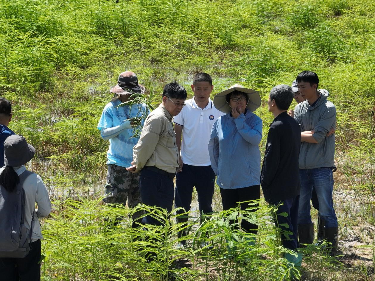 隨后,曹曉風(fēng)院士一行來到示范田,了解“黑土糧倉”科技會戰(zhàn)大安示范區(qū)與“黑土地產(chǎn)能和質(zhì)量提升的現(xiàn)代生物學(xué)技術(shù)”項(xiàng)目聯(lián)合開展的重度鹽堿地田菁種植技術(shù)示范情況。田菁在重度鹽堿地(pH 10.0-10.5,EC 700-1000 μS/cm)長勢喜人,在極度水澇的惡劣環(huán)境下仍然長勢可觀,并且形成了龐大的根系。曹曉風(fēng)院士說,田菁是從南方引進(jìn)的物種,經(jīng)過數(shù)百次篩選才培育出的極度耐鹽堿的品種,地上部分可作飼草,地下部分可修復(fù)鹽堿地,在鹽堿地治理及利用方面有很大潛力。