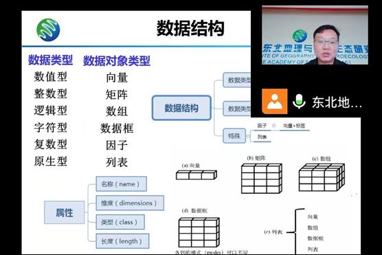本期培訓(xùn)采取線上線下相結(jié)合的模式,由東北地理所陳衛(wèi)衛(wèi)研究員擔(dān)任培訓(xùn)師。陳衛(wèi)衛(wèi)研究員重點(diǎn)講解了R語言的數(shù)據(jù)結(jié)構(gòu)與高級(jí)繪圖,主要包括數(shù)據(jù)類型介紹、數(shù)據(jù)創(chuàng)建、數(shù)據(jù)運(yùn)算、文件讀取與導(dǎo)出、統(tǒng)計(jì)圖形繪制、三維圖形繪制、社交地圖可視化等方面,并結(jié)合上一期培訓(xùn)介紹的基礎(chǔ)知識(shí),進(jìn)行了案例演示。