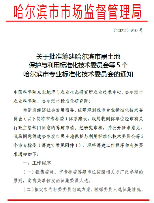 近日,中科院東北地理所農(nóng)業(yè)技術(shù)中心申請(qǐng)籌建哈爾濱市黑土地保護(hù)與利用專業(yè)技術(shù)標(biāo)準(zhǔn)化委員會(huì)獲批復(fù)。