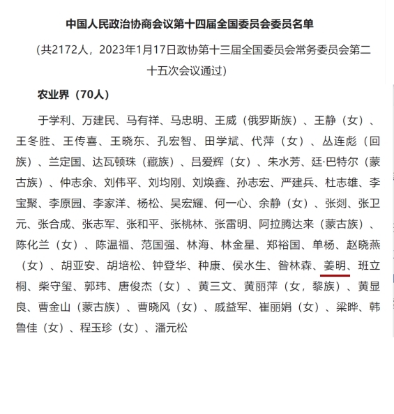 政協(xié)第十四屆全國委員會委員共2172人,分別來自34個界別,姜明是農(nóng)業(yè)界別當選70名委員之一。