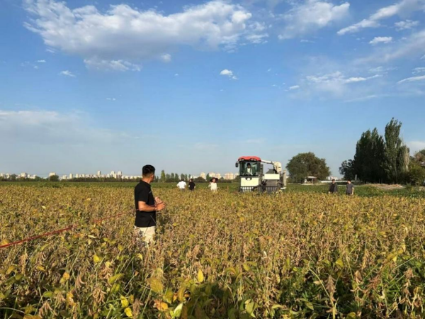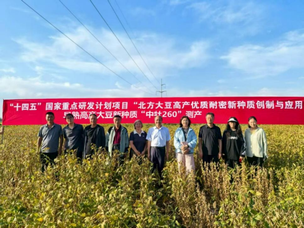 2025年8月30日,在新疆農(nóng)墾科學(xué)院石河子基地,專家組對劉寶輝團(tuán)隊承擔(dān)的“北方大豆高產(chǎn)新種質(zhì)創(chuàng)制與應(yīng)用項目中任務(wù)—早熟高產(chǎn)、理想株型種質(zhì)創(chuàng)制”任務(wù)(2021YFD1201101-02)中理想株型種質(zhì)“中牡260”(北豆40熟期組)小面積示范田進(jìn)行測產(chǎn)。專家組由中國農(nóng)業(yè)科學(xué)院油料作物研究所周新安研究員任組長、成員有新疆農(nóng)墾科學(xué)院研究員戰(zhàn)勇、新疆農(nóng)業(yè)科學(xué)院研究員叢花、石河子大學(xué)教授劉峰、黑龍江省農(nóng)業(yè)科學(xué)院牡丹江分院研究員任海祥。大豆育種專家杜維廣研究員、國家重點研發(fā)計劃項目負(fù)責(zé)人張淑珍教授、東北地理所大豆分子育種學(xué)科組翟紅研究員等全程參加本次測產(chǎn)。