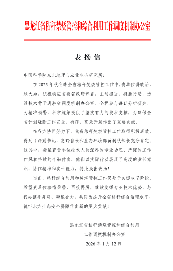 近日,黑龍江省秸稈禁燒管控和綜合利用工作調(diào)度機(jī)制辦公室以信函形式對(duì)中國(guó)科學(xué)院東北地理與農(nóng)業(yè)生態(tài)研究所予以表?yè)P(yáng),對(duì)東北地理所在2025年秋冬季秸稈焚燒管控工作中的重要貢獻(xiàn)表示感謝。濕地與全球變化學(xué)科組陳衛(wèi)衛(wèi)研究團(tuán)隊(duì)參與構(gòu)建黑龍江省秸稈數(shù)智化管控平臺(tái),并選派技術(shù)骨干石博文、王梧陽(yáng)、邢文甫等人全程參與省級(jí)調(diào)度和分析,為精準(zhǔn)預(yù)警和科學(xué)施策提供了關(guān)鍵科技支撐。