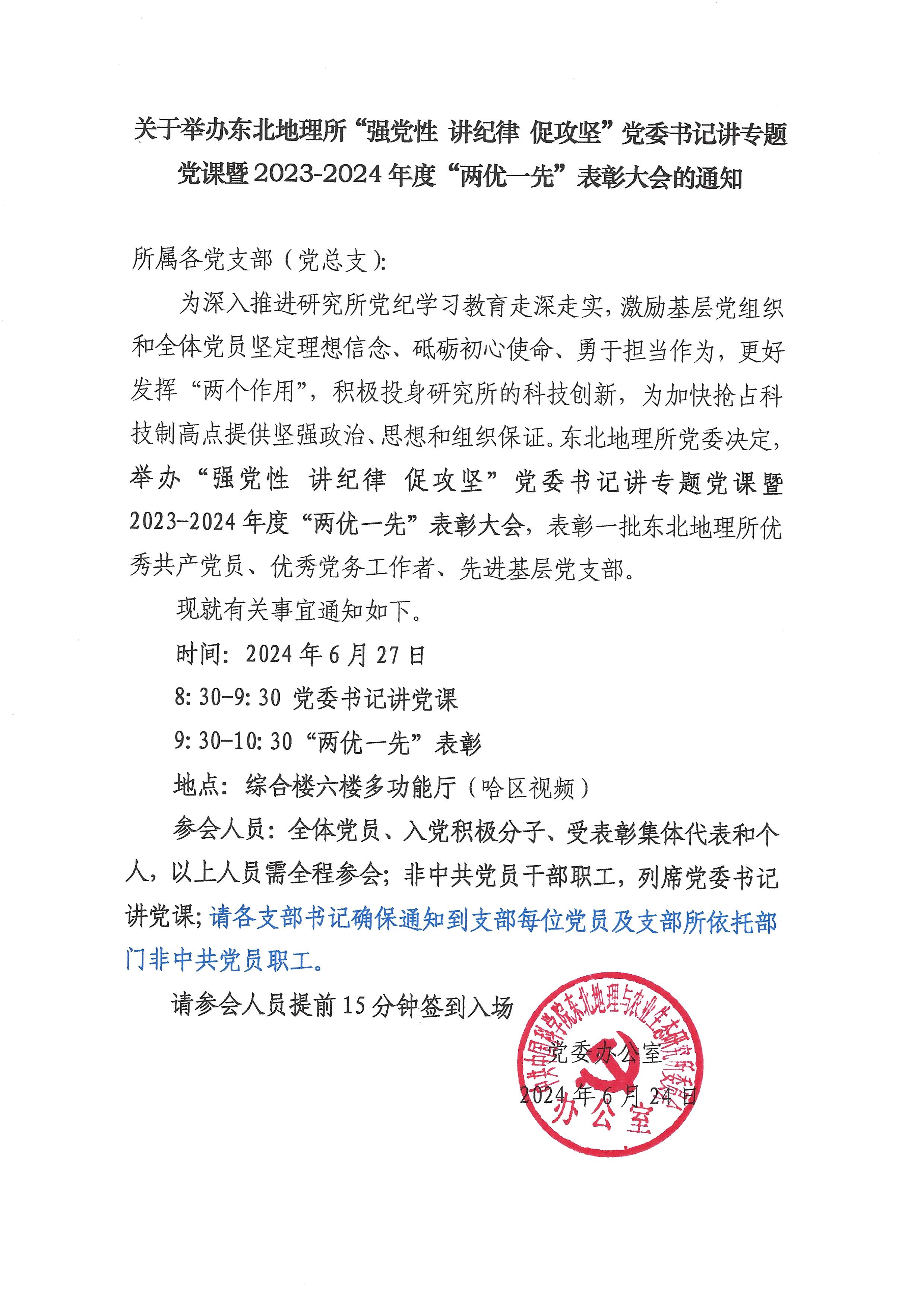關(guān)于舉辦東北地理所“強(qiáng)黨性 講紀(jì)律 促攻堅”黨委書記講專題黨課暨 2023-2024年度“兩優(yōu)一先”表彰大會的通知